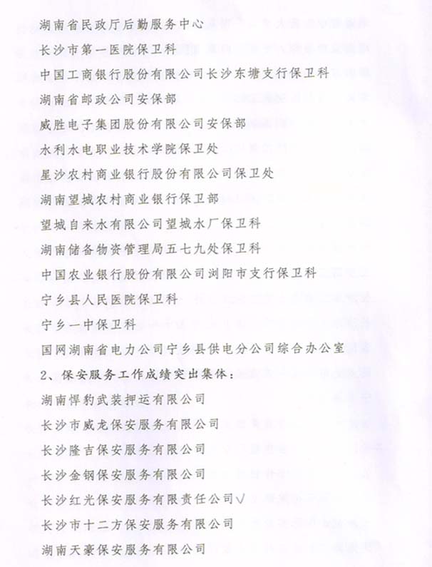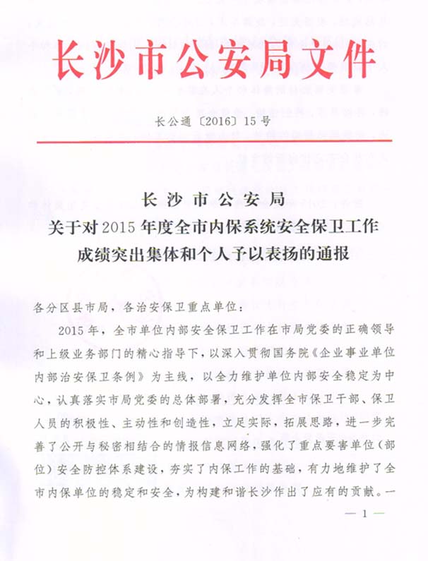 2015年度榮獲長沙市公安局安全保衛(wèi)工作成績突出集體榮譽(yù)獎勵